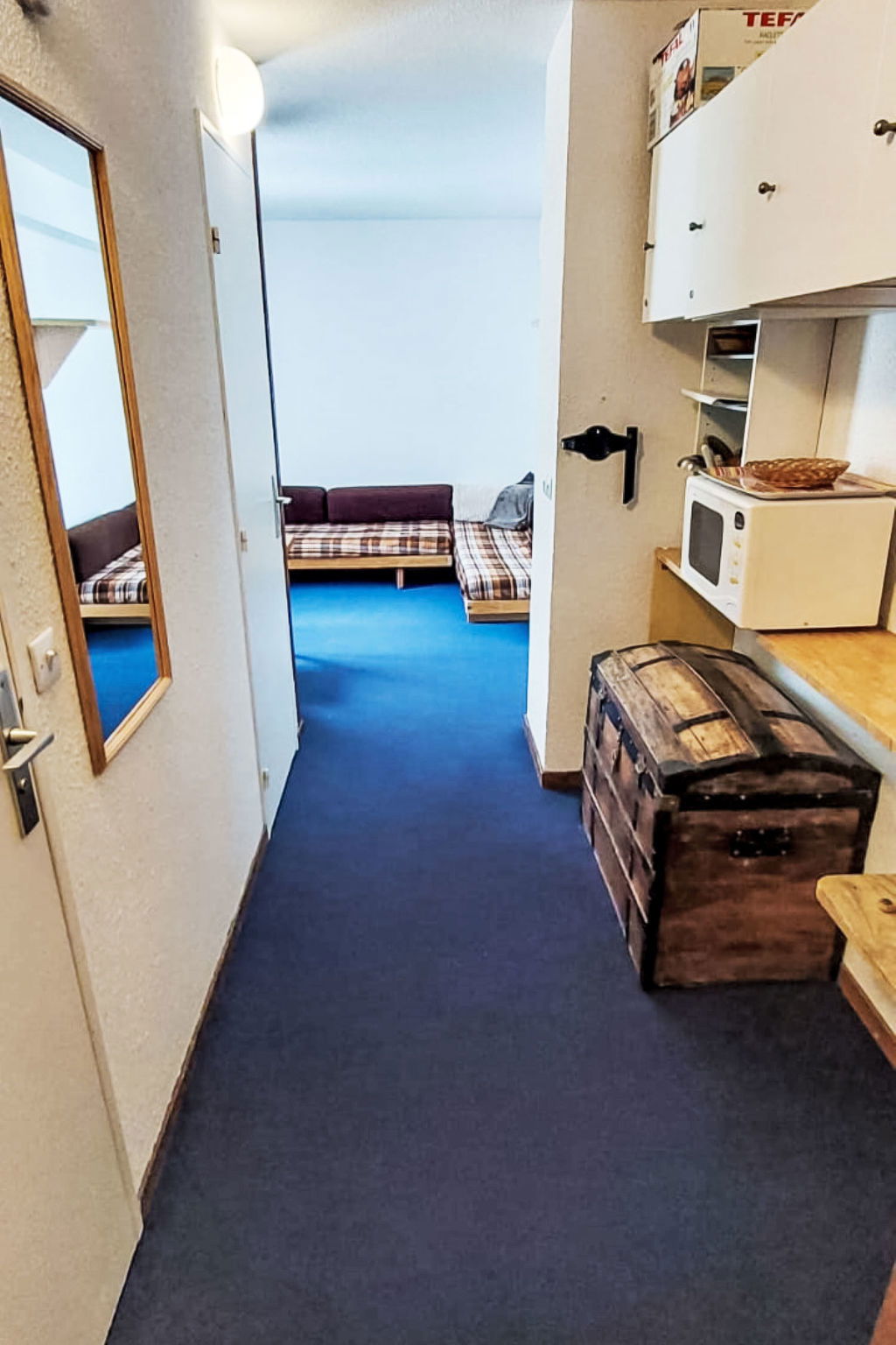 2-room apartment 30 m2 on 2nd floor, south-west facing position. Practical furnishings: dining room with TV (flat screen), radio. Exit to the balcony. 1 room with 2 x 2 bunk beds (90 cm, length 190 cm). Entrance hall with bath/WC. Kitchenette (4 hot plates, dishwasher, microwave, electric coffee machine, Capsules for coffee machine (Nespresso) extra). Small balcony, north facing position and west facing position. Beautiful view of the mountains. Please note: non-smokers only. Smoke alarm. 296 D007 46X