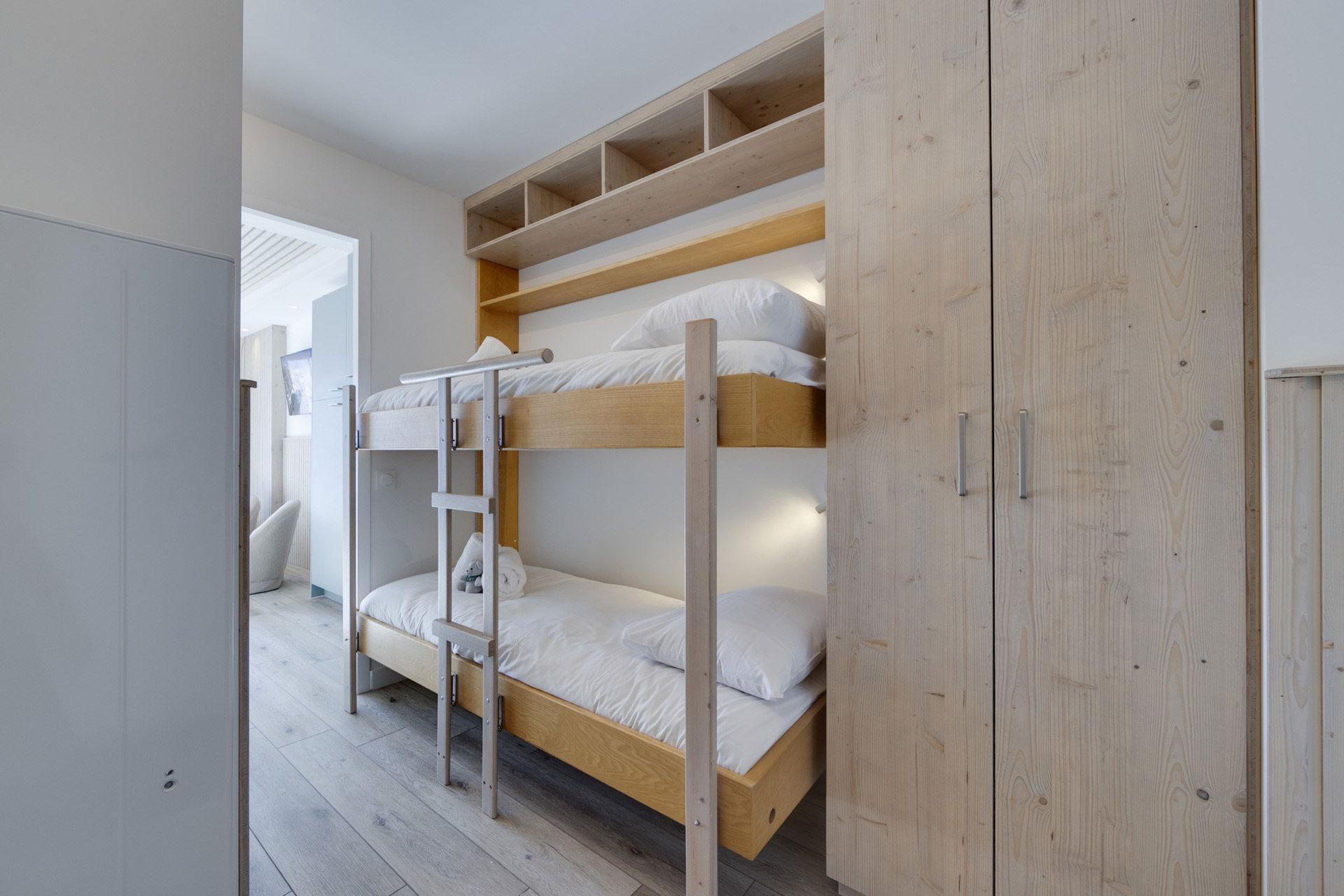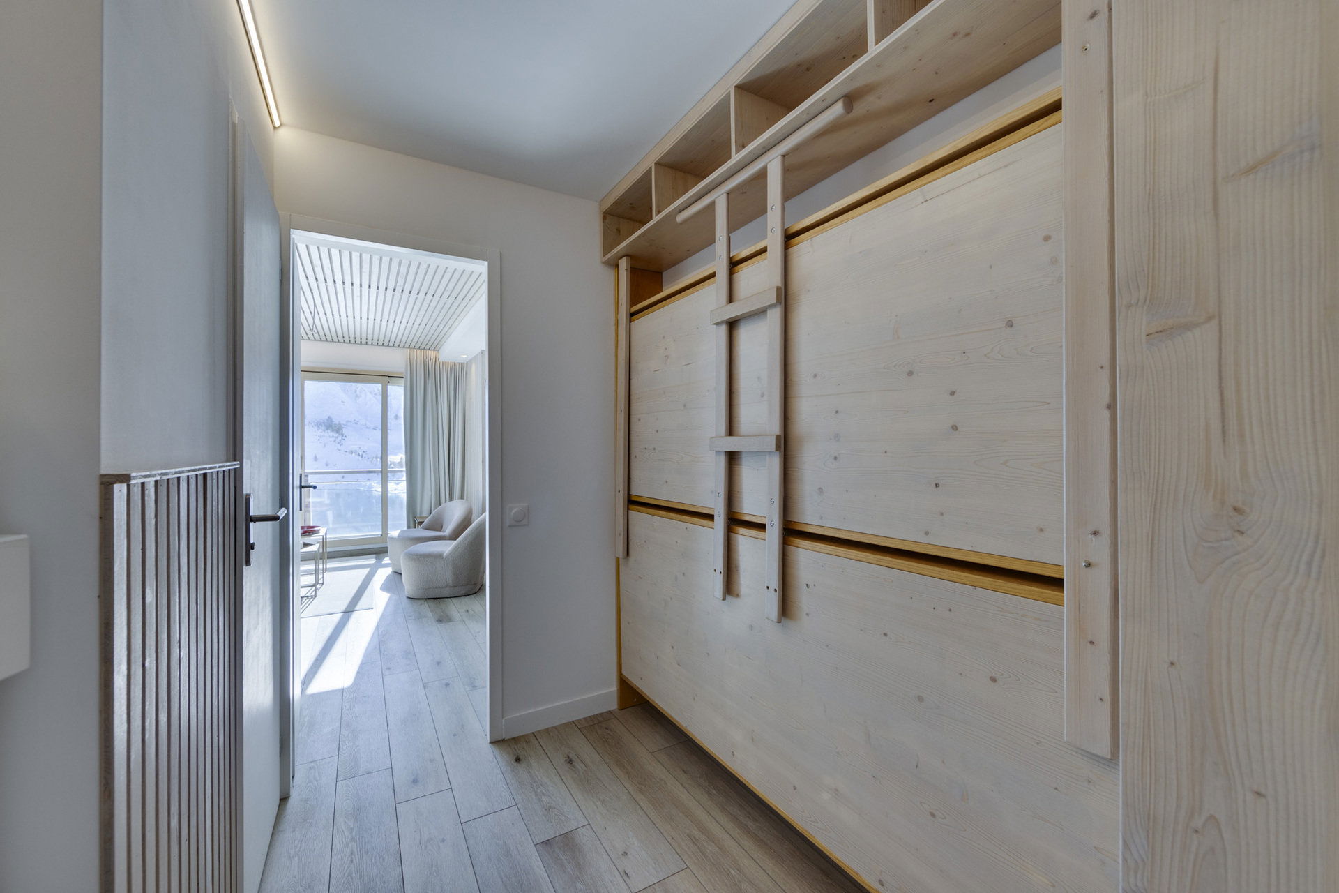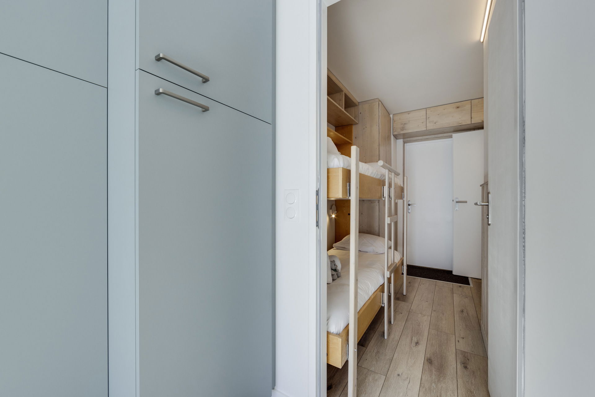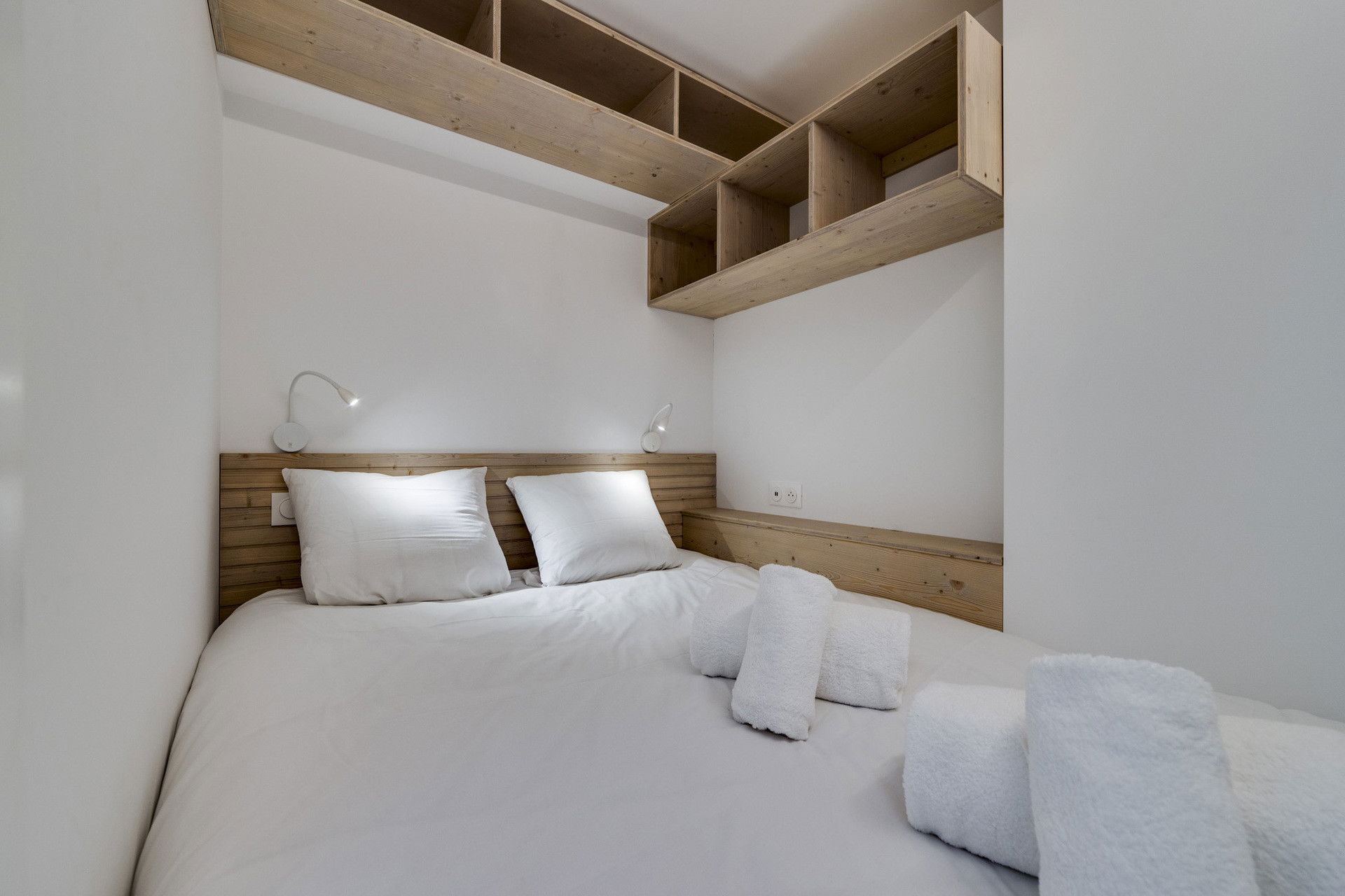 TIGNES LE LAC The apartment is located on the 5th floor of the residence in Tignes le lac. It can accommodate up to 4 people (2 adults and 2 children). With its south-facing exposure and breathtaking view of the lake, it will delight the whole family. LAYOUT - 1 cabin with double bed and storage box - 2 retractable bunk beds - 1 shower room - 1 separate toilet - Equipped kitchen - Dining area - TV lounge MISCELLANEOUS - Ski locker - The apartment does not have an exterior or parking space/garage - Deposit (not cashed): €1,200 SERVICES INCLUDED - Linen (sheets, towels) - Beds made on arrival - Bathroom products - End of stay cleaning SERVICE NOT INCLUDED - Tourist tax