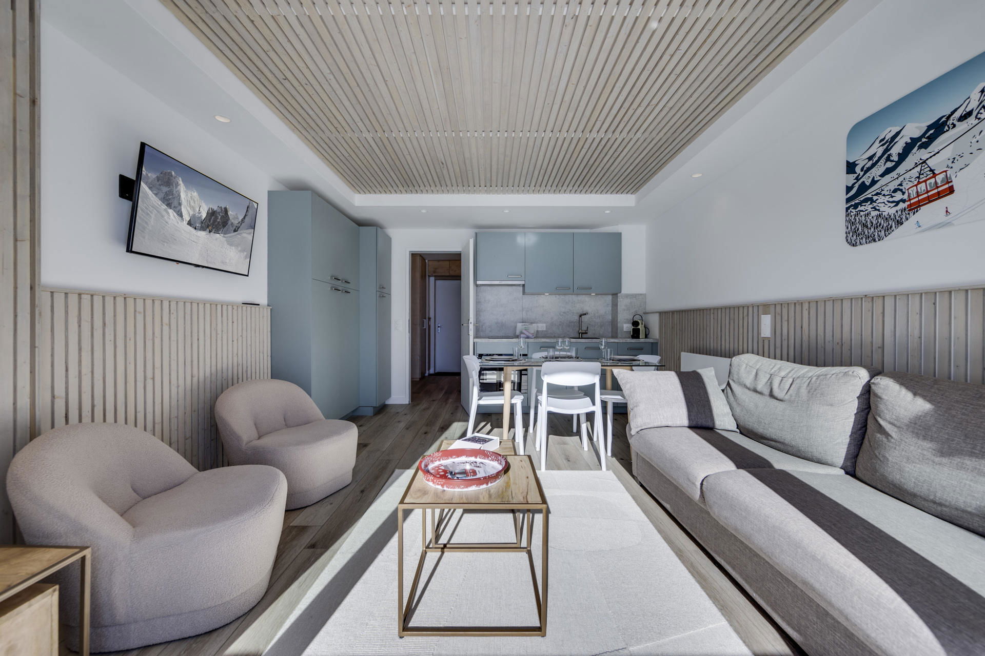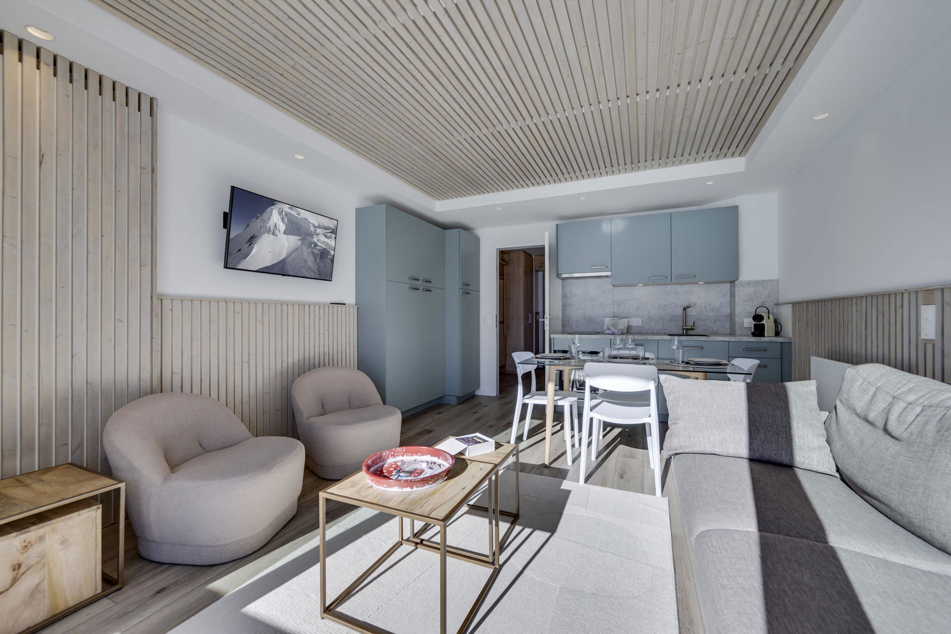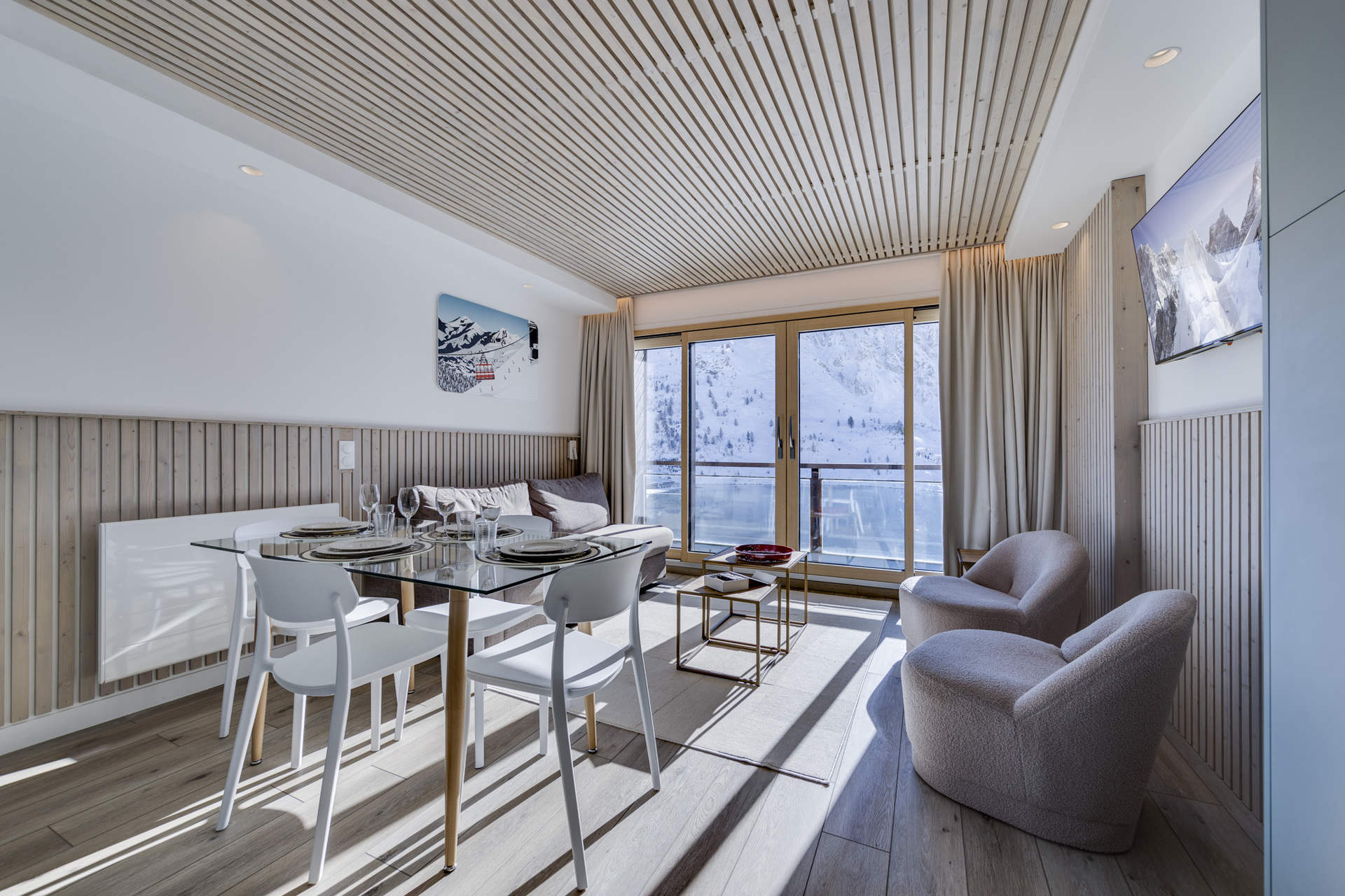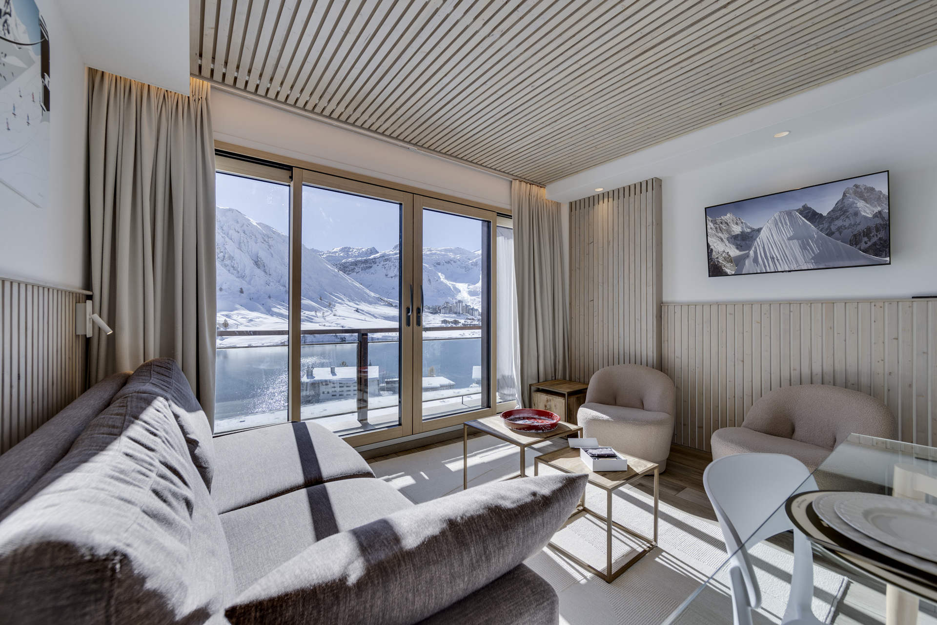 TIGNES LE LAC The apartment is located on the 5th floor of the residence in Tignes le lac. It can accommodate up to 4 people (2 adults and 2 children). With its south-facing exposure and breathtaking view of the lake, it will delight the whole family. LAYOUT - 1 cabin with double bed and storage box - 2 retractable bunk beds - 1 shower room - 1 separate toilet - Equipped kitchen - Dining area - TV lounge MISCELLANEOUS - Ski locker - The apartment does not have an exterior or parking space/garage - Deposit (not cashed): €1,200 SERVICES INCLUDED - Linen (sheets, towels) - Beds made on arrival - Bathroom products - End of stay cleaning SERVICE NOT INCLUDED - Tourist tax