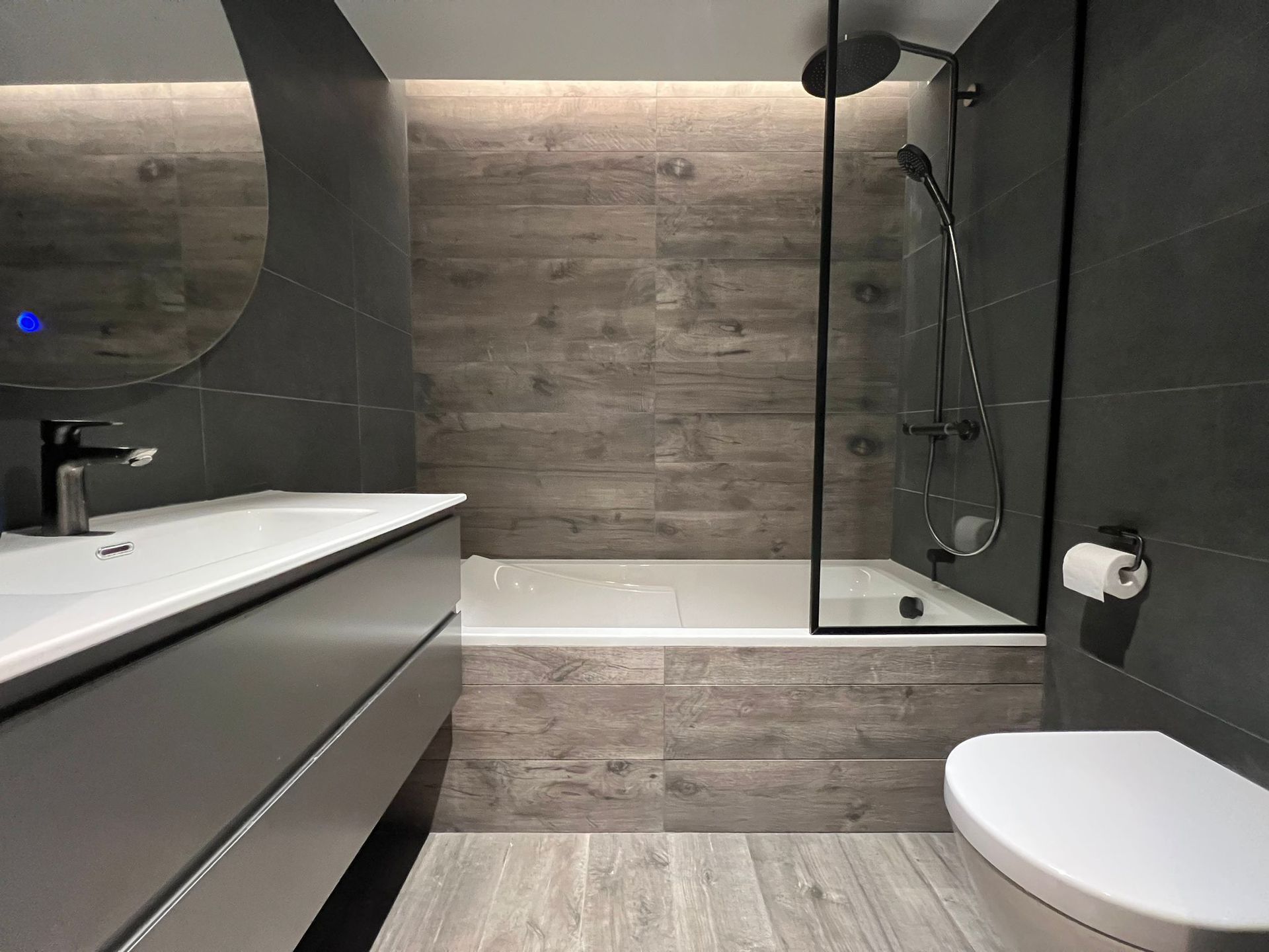 *1 shared bathroom with bath, double sink and WC