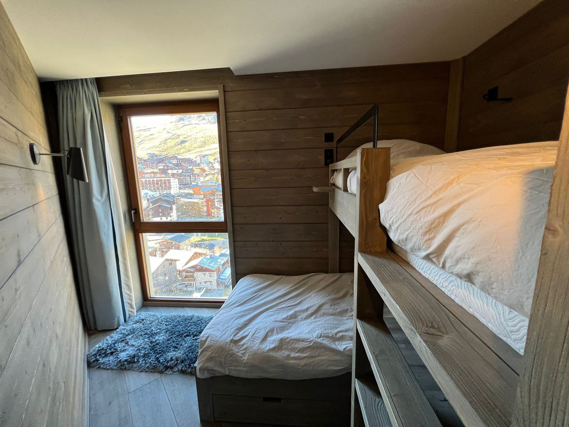 *Twin bedroom with 2 single beds in a staggered layout « bunk bed style » 90 x 200 cm
