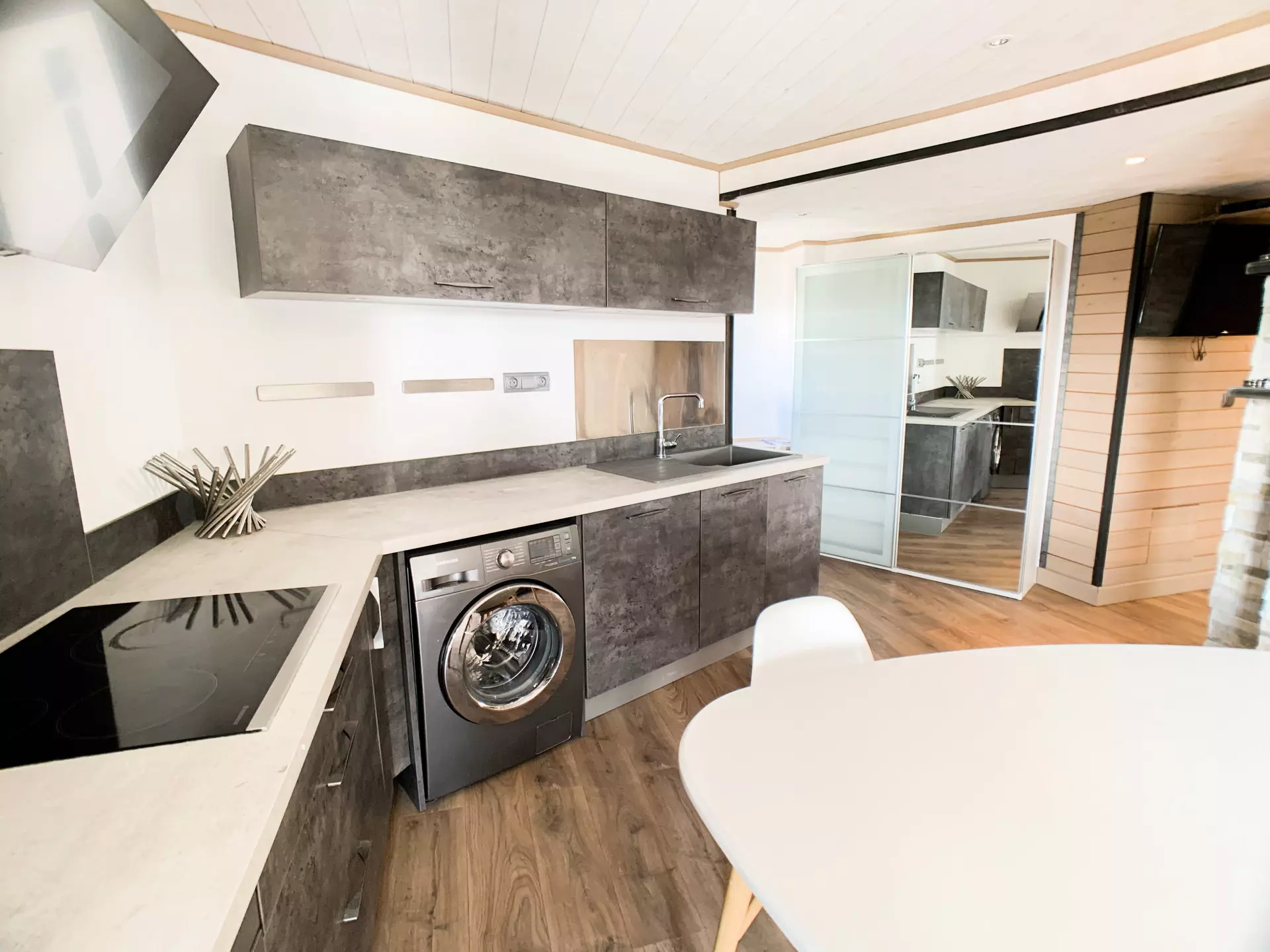 Open kitchen with electric hob, oven, combined fridge and dishwasher