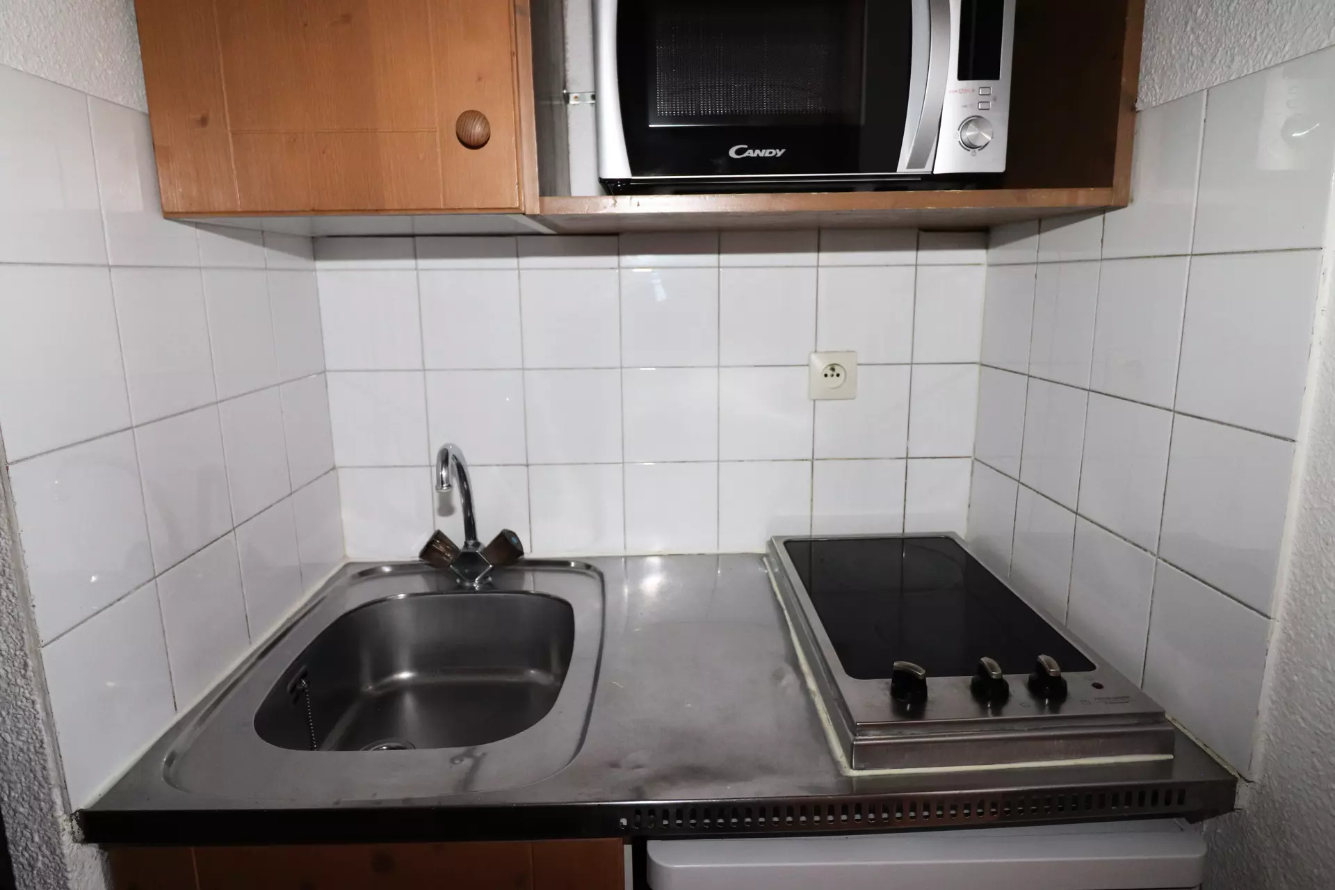 Kitchenette with 2 ceramic hobs, fridge and microwave.