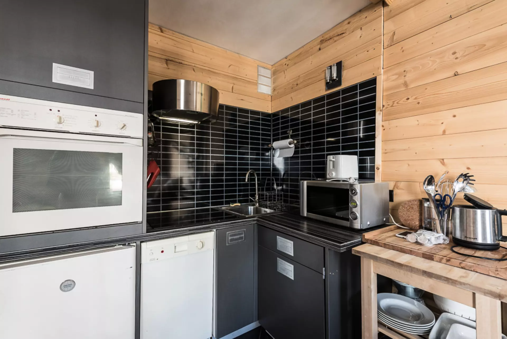 Kitchen area equipped with electric hob, dishwasher, microwave and oven