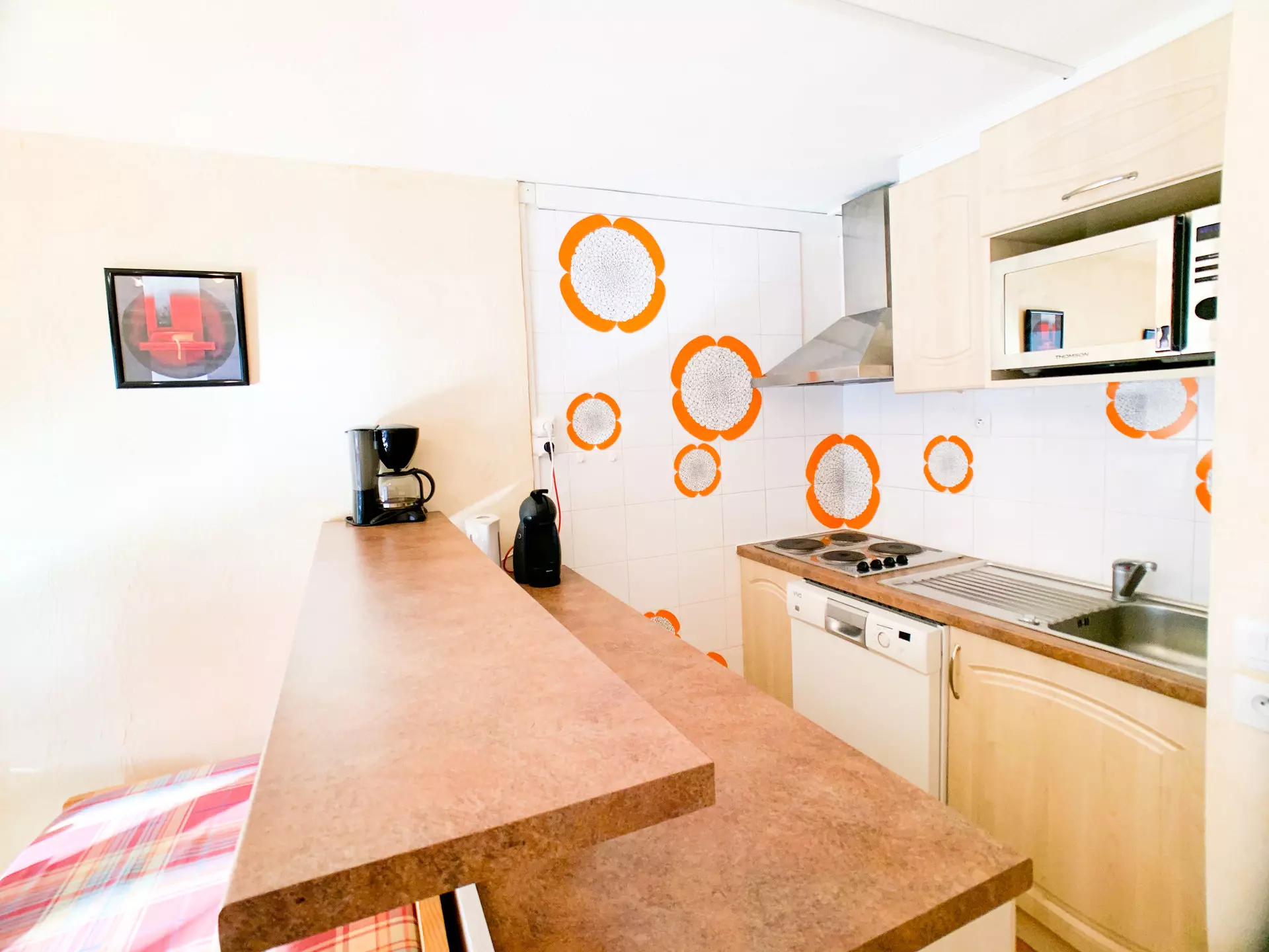 Kitchenette equipped with electric hob, oven and refrigerator.